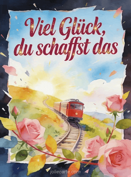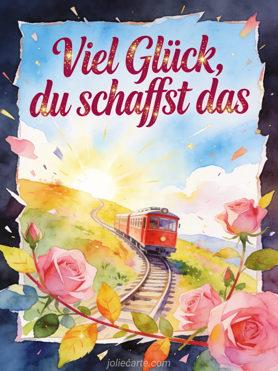 Ermutige jemanden mit einer Viel-Glück-Karte, auf der ein kleiner roter Zug einen sonnigen Hügel hinauffährt, eingerahmt von Rosen und hellen Blättern. Entdecke auch eine kostenlose Viel Glück Karte, eine Viel Glück Karte oder einen Viel Glück bei deiner Prüfung Text.