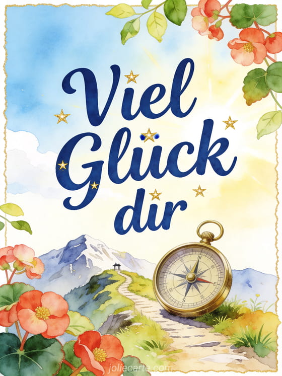 Sende Mut und Unterstützung mit kobaltblauer Schrift, einem Messingkompass, einem hellen Bergweg und Begonien, die über den Rand wachsen. Entdecke auch eine Auf Wiedersehen und viel Glück Karte, einen Text um viel Glück zu wünschen oder ein Viel Glück bei deiner Prüfung Bild.