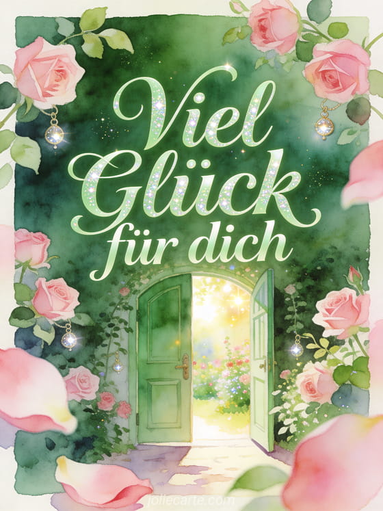 Sende Viel Glück für dich mit eleganter jader Grüßschrift, einer grünen Glückstür zu einem strahlenden Garten, Rosen und kleinen glänzenden Glücksbringern. Entdecke auch Viel Glück bei deiner Prüfung Text, kostenlose animierte GIFs viel Glück oder eine Nachricht um viel Glück für eine Prüfung zu wünschen.