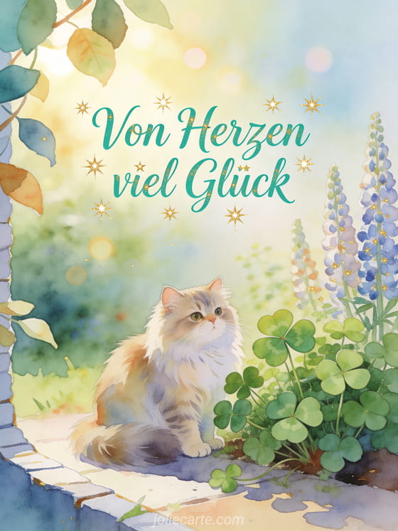 Sende eine zärtliche Viel-Glück-Karte mit einer flauschigen Perserkatze neben Glücksklee in einer hellen Gartenecke, eingerahmt von Lupinen und Blättern. Entdecke auch ein kostenloses animiertes Viel Glück GIF, ein Viel Glück Wettbewerb Bild oder ein Viel Glück bei deinen Prüfungen GIF.