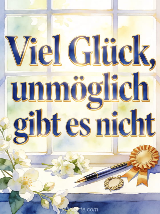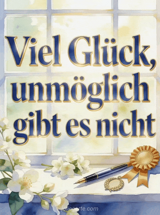Sende eine zuversichtliche Viel-Glück-Karte mit einer Siegerschleife, einem polierten Stift, einem Lorbeeranhänger und Jasminblüten im hellen Fensterlicht. Du kannst auch ein Viel Glück Bild mit einem Pferd, ein Viel Glück Ermutigung GIF oder eine kostenlose Viel Glück Karte senden.