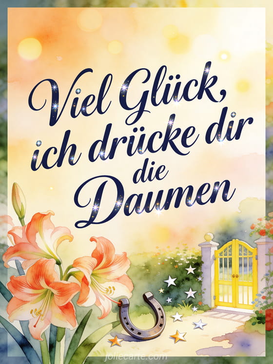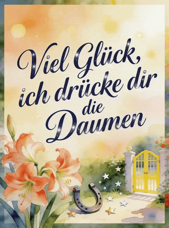 Sende eine herzliche Viel-Glück-Nachricht mit marineblauer Schrift, feinen Glanzlichtern, einem Glückshufeisen, Amaryllisblüten und Sternkonfetti an einem hellen Gartentor. Teile auch Auf Wiedersehen und viel Glück Text, eine Glückwunschkarte Vorlage oder alles Gute für die Zukunft.