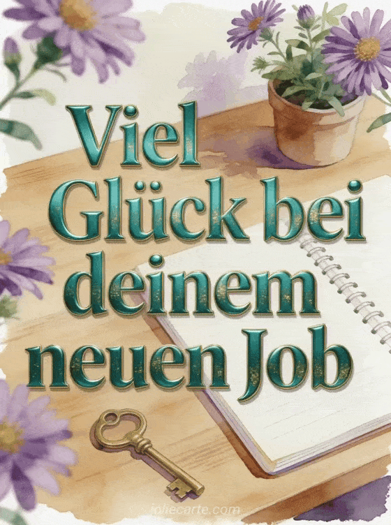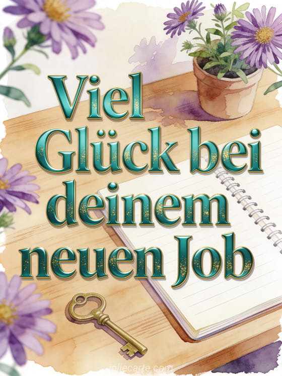 Teile viel Glück für den neuen Job mit einem ordentlichen Eichenschreibtisch, einem frischen Notizbuch, einer kleinen Pflanze, einem Messingschlüssel und violetten Astern. Entdecke auch ein Bild um viel Glück zu sagen, einen Text um viel Glück für eine Prüfung zu wünschen oder animierte Viel Glück GIFs.