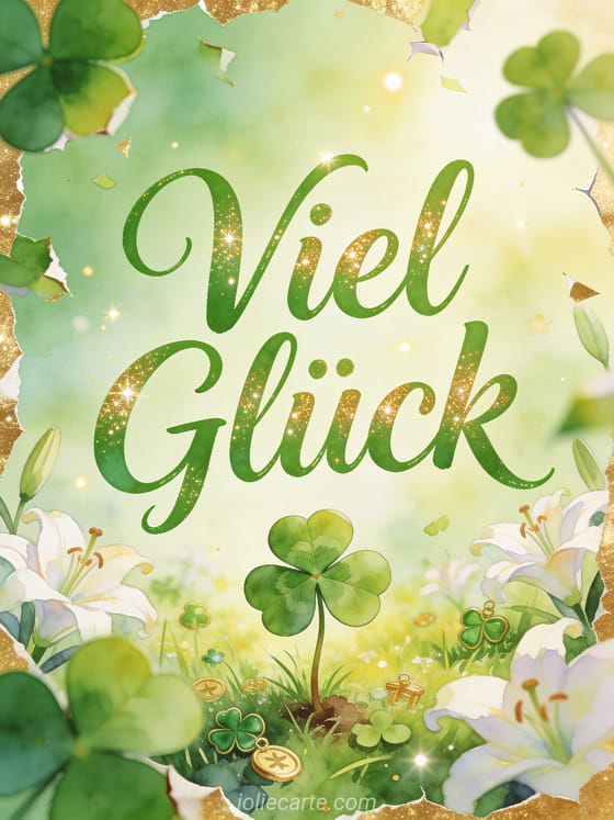 Sende einen strahlenden Glückswunsch mit dieser Aquarellkarte, auf der ein vierblättriges Kleeblatt in einer sonnigen Wiese zwischen Lilien und kleinen Glücksbringern wächst. Entdecke auch Viel Glück neuer Job Karte, Bild um viel Glück zu sagen oder Text um viel Glück für eine Prüfung zu wünschen.