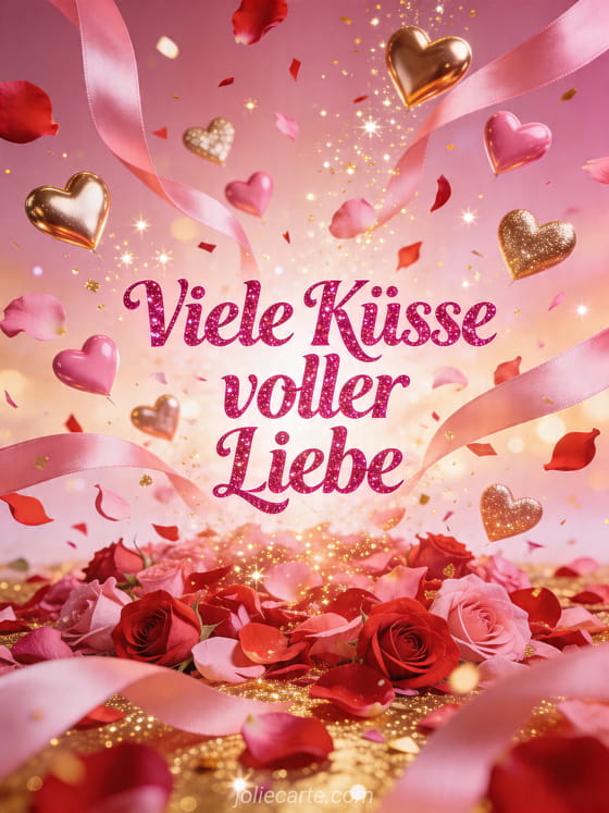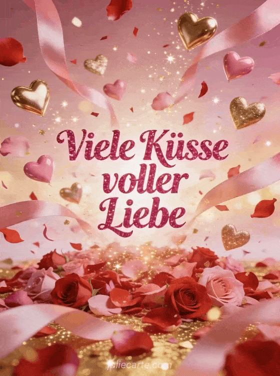 Senden Sie eine lebendige romantische Botschaft mit dieser kostenlosen Karte mit Liebesküssen voller Rosenblätter, fliegender Herzen und funkelnder Bänder. Entdecken Sie auch süße träume gute nacht küsse ich liebe dich, tausend küsse von herzen oder herz herz liebesküsse gif.