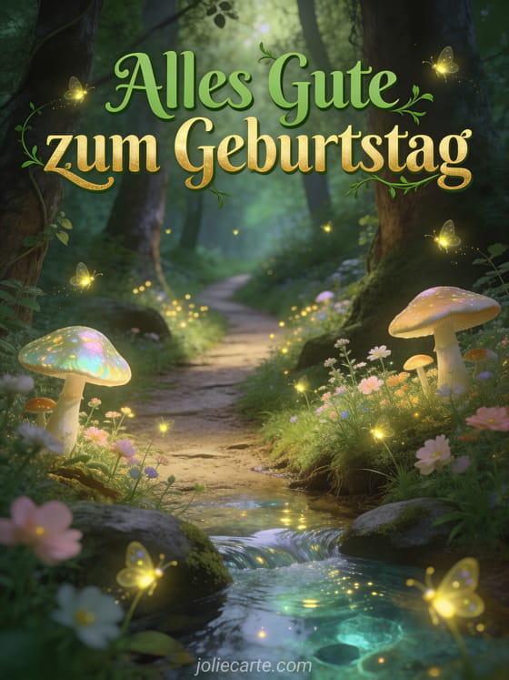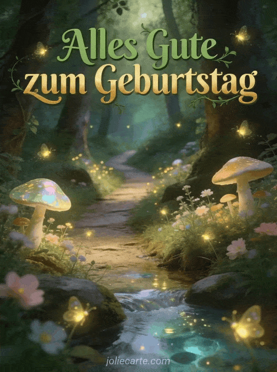 Begeistern Sie Ihre Liebsten mit dieser virtuellen animierten Geburtstagskarte mit einem magischen Zauberwaldpfad mit leuchtenden Glühwürmchen und Feenpilzen. Entdecken Sie auch eine animierte Geburtstagskarte Kamel Musik kostenlos oder kostenlose animierte Geburtstagskarten für weitere Optionen.