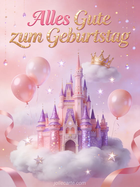 Senden Sie diese bezaubernde virtuelle Geburtstagskarte für eine kleine Prinzessin mit einem funkelnden Schloss auf einer Wolke, einer goldenen Krone und fallendem Glitzer. Entdecken Sie auch eine Karte Alles Gute zum Geburtstag kleines Einhorn oder ein Bild Alles Gute zum Geburtstag Baby.