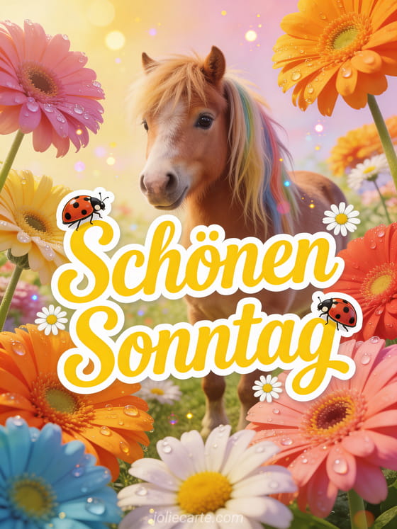 Sende einen bunten schönen Sonntag mit leuchtenden Gerbera, Marienkäfern, Margeriten und einem niedlichen Shetlandpony im warmen goldenen Licht. Entdecke auch schönen Sonntag animiertes GIF, schöne Bilder schönen Sonntag Küsschen oder eine schöne Karte schönen sonnigen Sonntag.