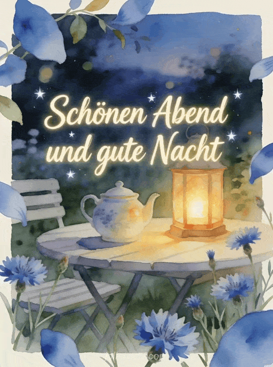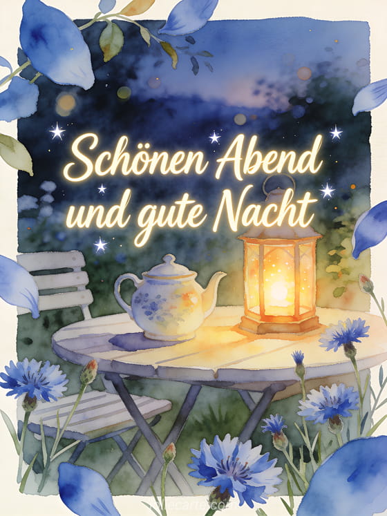 Teile eine virtuelle Karte für schönen Abend und gute Nacht mit warmer elfenbeinfarbener Schrift, einem Gartentisch in der Dämmerung, einer Porzellan-Teekanne, Laternenlicht und Kornblumen. Du kannst auch eine schöne Gute-Nacht-Nachricht, eine Gute-Nacht-Nachricht für ihn oder eine Nachricht zum Wünschen einer guten Nacht senden.