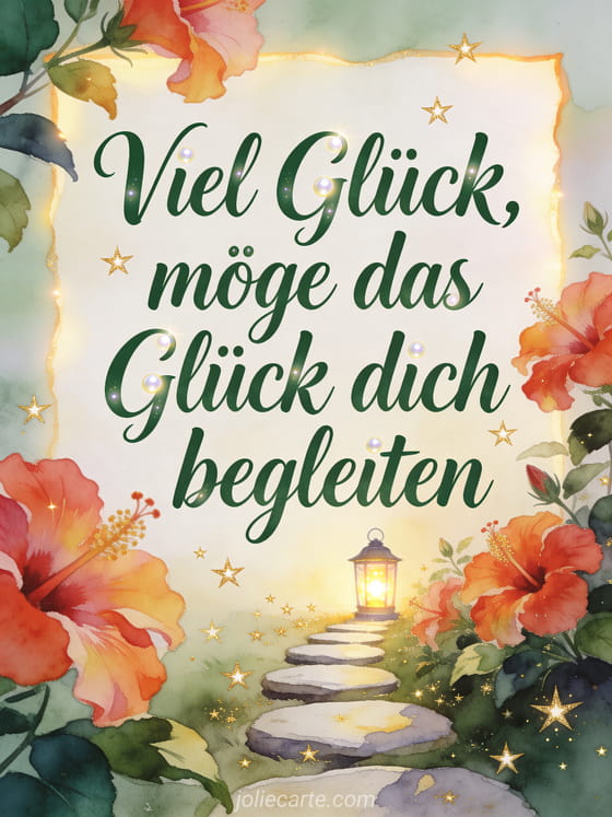 Ermutige jemanden mit einer poetischen Viel-Glück-Karte, die einen hellen Trittsteinweg durch Hibiskusblüten zu einer kleinen Laterne und goldenen Sternen zeigt. Entdecke auch ein Viel Glück vierblättriges Kleeblatt Bild, eine Viel Glück neuer Job Karte oder ein Bild um viel Glück zu sagen.