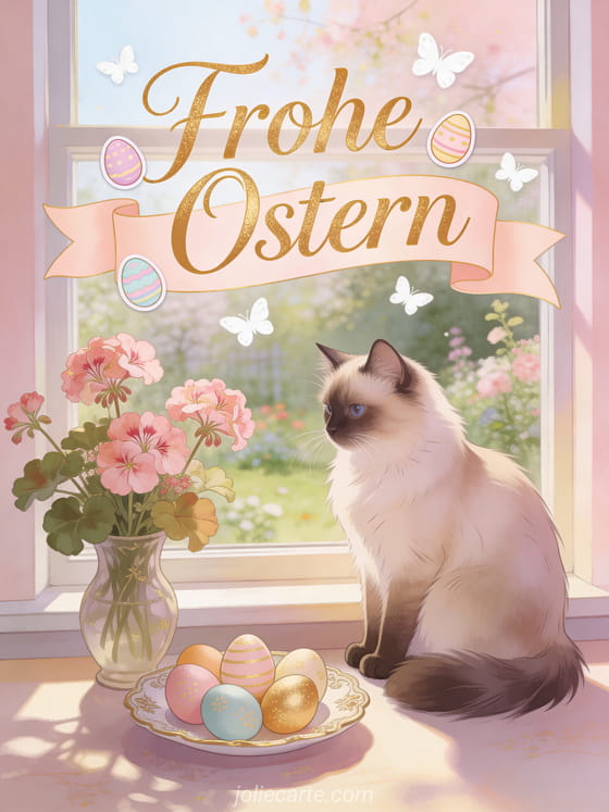 Senden Sie diese bezaubernde virtuelle Osterkarte mit einer Birma-Katze auf der Fensterbank neben einer Vase mit Studentenblumen und Geranien, bemalten Ostereiern auf einem Vintage-Teller und einem Fruehlingsgarten durch das Fenster. Entdecken Sie auch eine Osterkarte, eine Ostergrusskarte oder eine Osterkarte gratis.