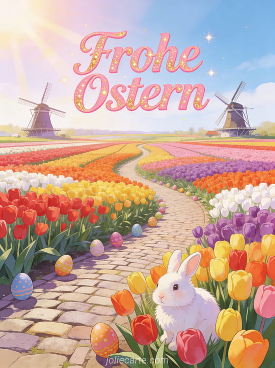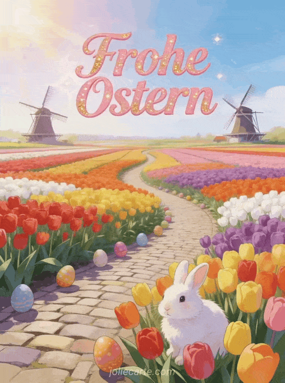 Feiern Sie Ostern mit dieser bezaubernden kostenlosen animierten Grußkarte mit ein Panoramablick auf die Tulpenfelder von Keukenhof mit endlosen Reihen bunter Tulpen, zwei Windmühlen, Ostereiern und einem weißen Kaninchen. Entdecken Sie auch joyeuses paques image carte virtuelle paques.