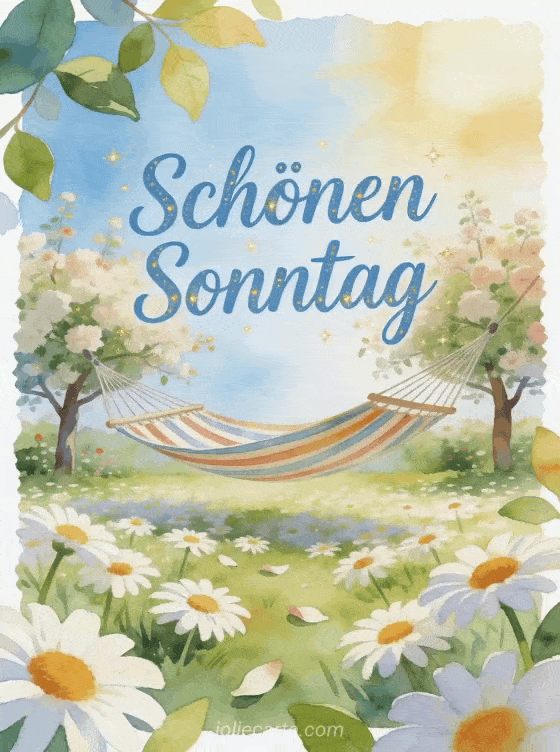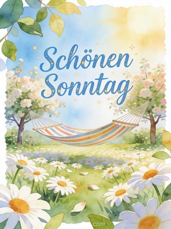 Sende einen friedlichen schönen Sonntag Gruß mit luftigen himmelblauen Buchstaben, goldenen Funken, einer gestreiften Hängematte zwischen blühenden Gartenbäumen und einem Teppich aus Margeriten in warmer Sonne. Teile auch Guten Morgen schönen Sonntag Bilder, Schönen Sonntag Bilder mit Blumen oder eine Nachricht um schönen Sonntag zu sagen.