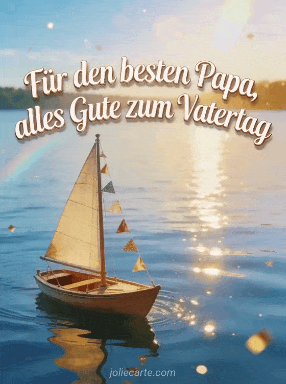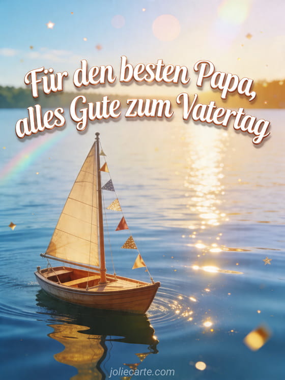 Nutzen Sie eine Vorlage für Vatertagskarte mit eleganter weißer Schrift, einem kleinen Holzsegelboot auf einem ruhigen blauen See bei Sonnenaufgang, goldenen Spiegelungen und kleinen festlichen Wimpeln. Entdecken Sie auch ein Vatertag Foto, zärtliche Worte zum Vatertag oder ein Vatertagsgedicht.