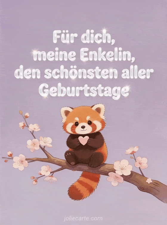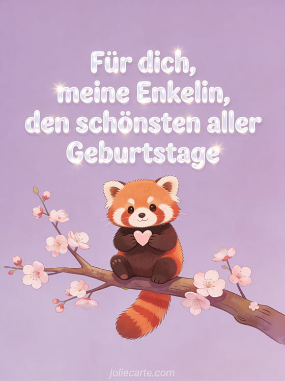 Schenke deiner Enkelin eine zarte Geburtstagskarte mit einem süßen roten Panda, der auf einem blühenden Pflaumenzweig sitzt und ein kleines Herz hält. Entdecke auch eine Alles Gute zum Geburtstag Karte meine Enkelin, eine Alles Gute zum Geburtstag für meine Enkelin Karte oder eine alles gute zum geburtstag an meine enkelin.
