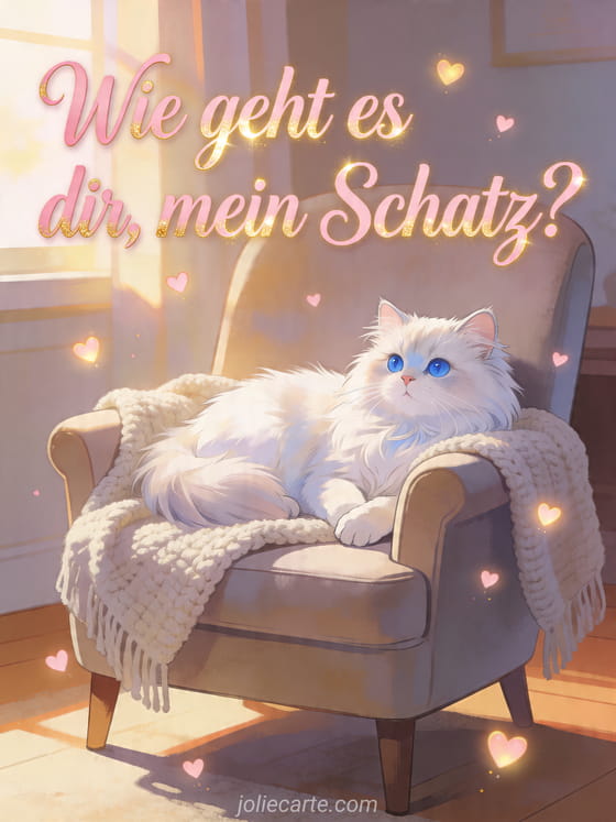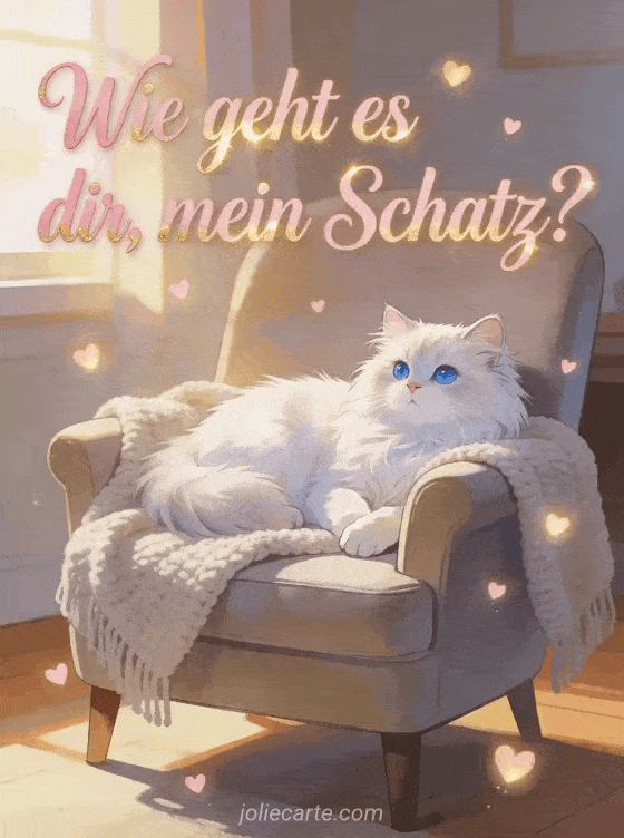Teile eine süße Liebesbotschaft mit einer weißen Perserkatze, leuchtenden kleinen Herzen und einer gemütlichen romantischen Stimmung. Entdecke auch hallo wie geht es dir, hallo wie geht's und guten Morgen wie geht es dir.