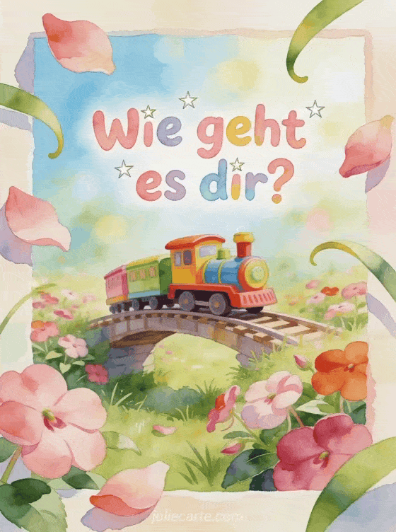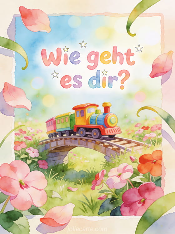 Sende einen verspielten Gruß mit runden Aquarellbuchstaben, einem bunten Spielzeugzug auf einer kleinen Wiesenbrücke und Blütenblättern von Fleißigem Lieschen über dem Rand. Entdecke auch eine Hallo meine Süße wie geht es dir, eine wie geht es dir meine Tochter Karte oder einen Gruß mit wie geht es dir Liebste.