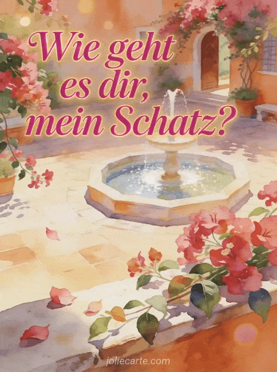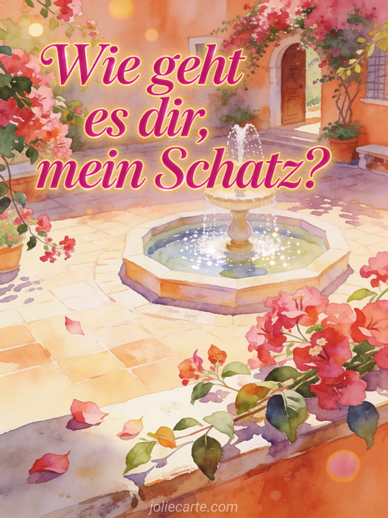 Frage warmherzig nach mit leuchtender fuchsiafarbener Schrift, Bougainvilleablüten, einem kleinen Brunnen und funkelndem Wasser in einem sonnigen mediterranen Hof. Entdecke auch eine ja es geht gut mein Schatz, eine wie geht es meiner Tochter Karte oder einen Gruß mit hallo Freunde wie geht es euch.