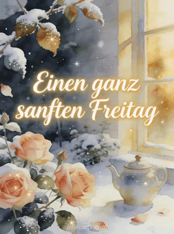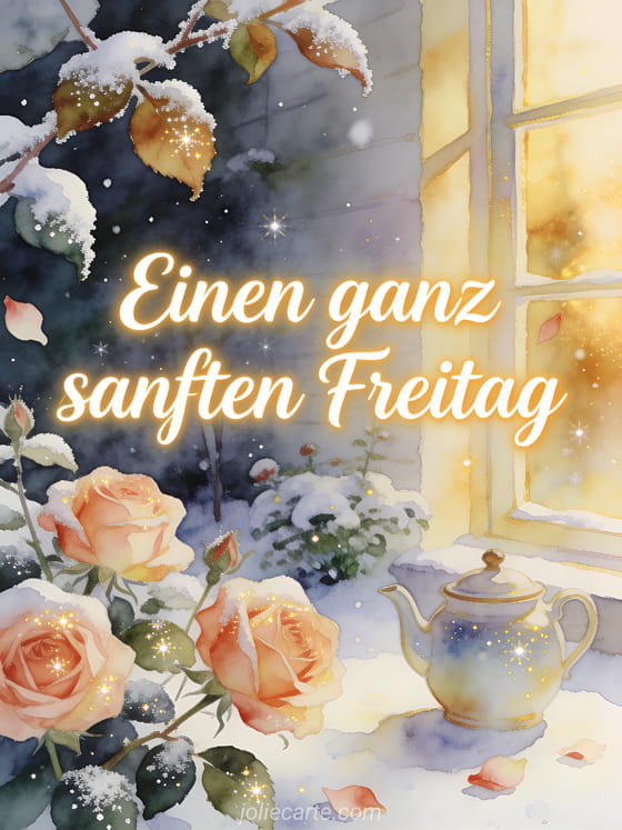Wünsche einen ganz sanften Freitag mit schneebedeckten Rosen, einer Teekanne aus Keramik und goldenem Fensterlicht in einem gemütlichen Wintergarten. Du kannst auch Guten Morgen es ist Freitag Bild, Guten Morgen und schönen Freitag Bilder oder Schönen Freitag meine Liebe Bilder senden.