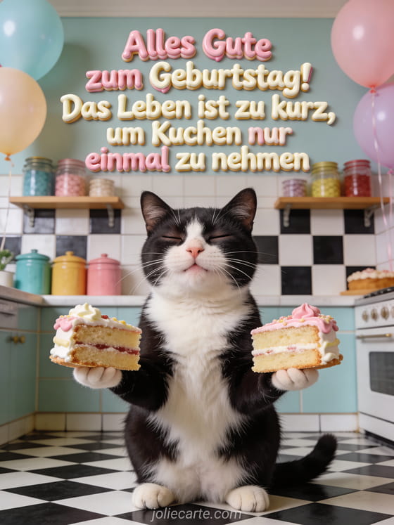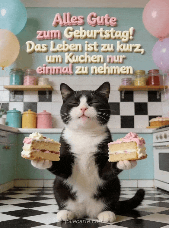 Bringen Sie sie zum Lachen mit dieser witzigen Geburtstagskarte mit einer fotorealistischen schwarz-weißen Katze und zwei Kuchenstücken. Entdecken Sie auch ein lustiges Geburtstag Katze gif oder ein gif geburtstag lustig.