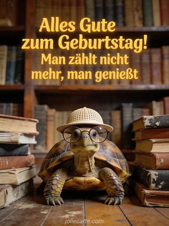 Bringen Sie Ihre Lieben zum Lachen mit diesem witzigen Geburtstags-Gif mit einer entzückenden Schildkröte mit Lesebrille und Melonenhut. Entdecken Sie auch ein lustiges Geburtstags-Gif animiert oder einen animierter Geburtstagshumor für noch mehr Spaß.