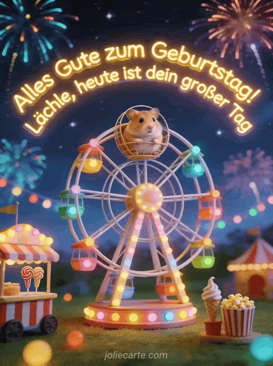 Diese verspielte Geburtstagskarte mit Hamster im Riesenrad, Lichterglanz und Partygefühl bringt sofort gute Laune. Entdecke auch alles Gute zum Geburtstag animiertes GIF Humor, lustiges geburtstagsvideo und lustig witziger Geburtstag Hund.