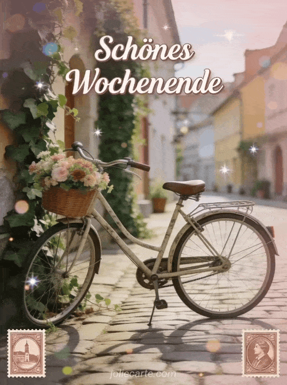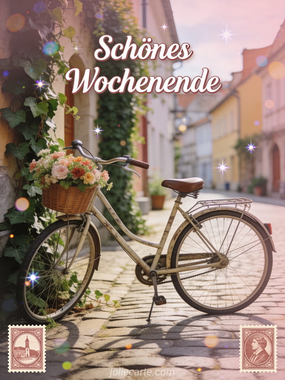 Wünschen Sie ein schönes Wochenende mit dieser bezaubernden Vintage-Postkarte, die ein altmodisches Fahrrad mit Blumenkorb auf einer Kopfsteinpflasterstraße in einem europäischen Dorf mit efeubewachsenen Wänden zeigt. Entdecken Sie auch ein schönes sonniges wochenende oder ein schönes wochenende humor.