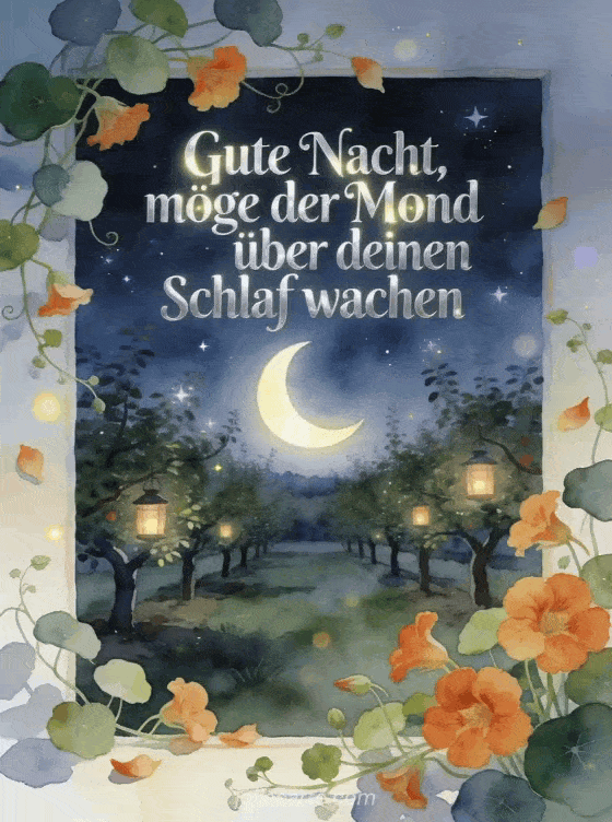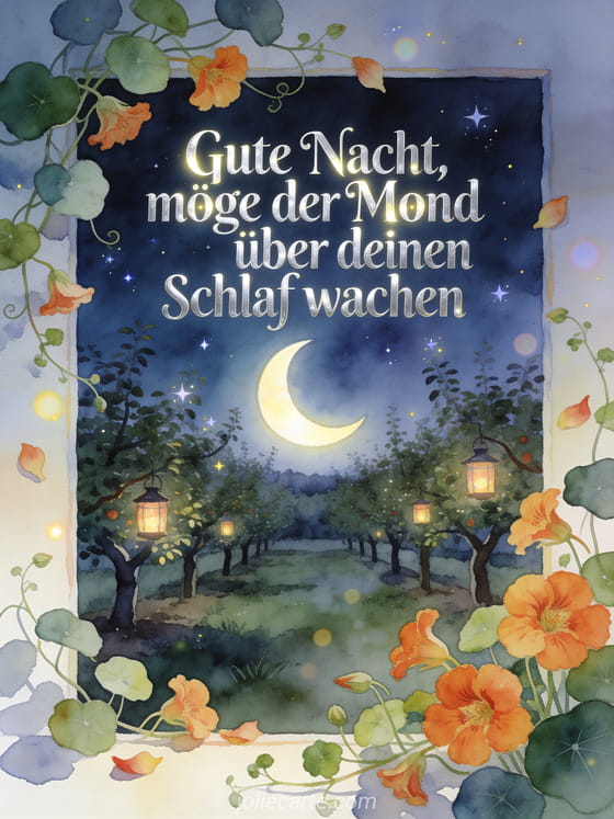 Teile eine wunderschöne Gute-Nacht-Nachricht mit einer Aquarellkarte aus einem mondbeschienenen Obstgarten, kleinen Laternen in den Zweigen und Kapuzinerkresse über dem Rand. Du kannst auch eine Gute Nacht SMS-Nachricht senden, eine Gute-Nacht-Nachricht für meinen Schatz wählen oder eine Gute Nacht Wunsch Nachricht teilen.