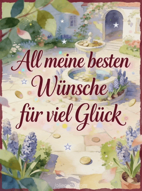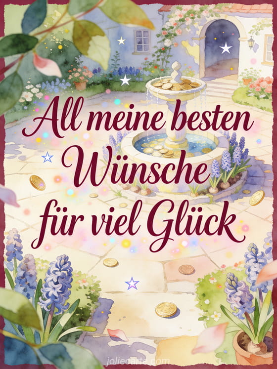 Teile Wünsche für viel Glück mit einem hellen Wunschbrunnen, umgeben von Hyazinthen, Münzen, kleinen schwebenden Sternen und einem blühenden Innenhof. Entdecke auch kostenlose Viel Glück Bilder, einen Text viel Glück für alles Weitere oder und vor allem viel Glück GIF.