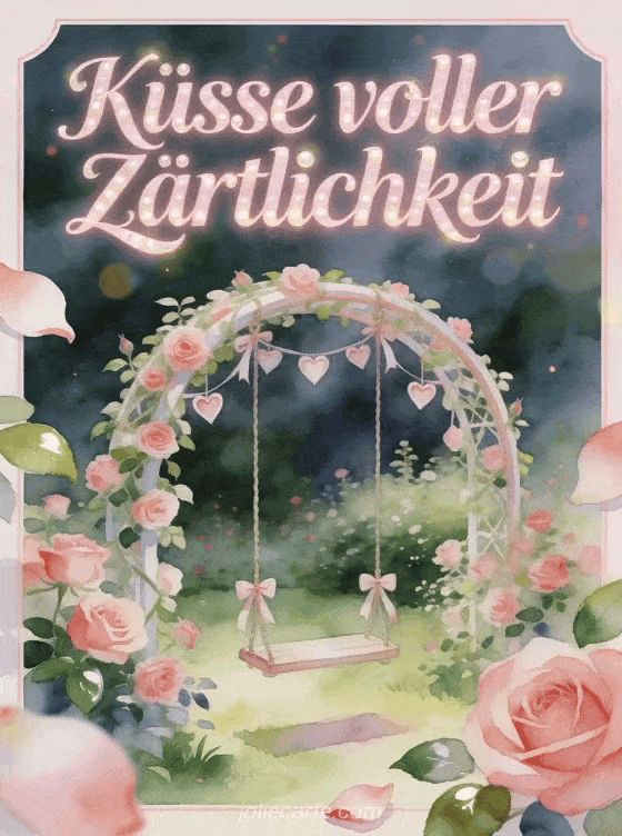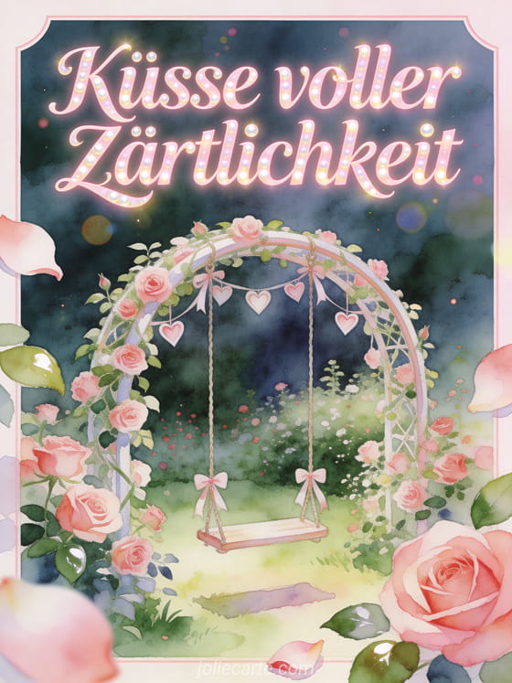 Teile Küsse voller Zärtlichkeit mit einem Rosengarten in Aquarell, einer geschwungenen Schaukel mit kleinen Herzschleifen und leuchtendem romantischem Licht. Entdecke auch Schmetterlingsküsse GIF, kostenloses Küsschen Bild oder viele Küsse animiertes gif.