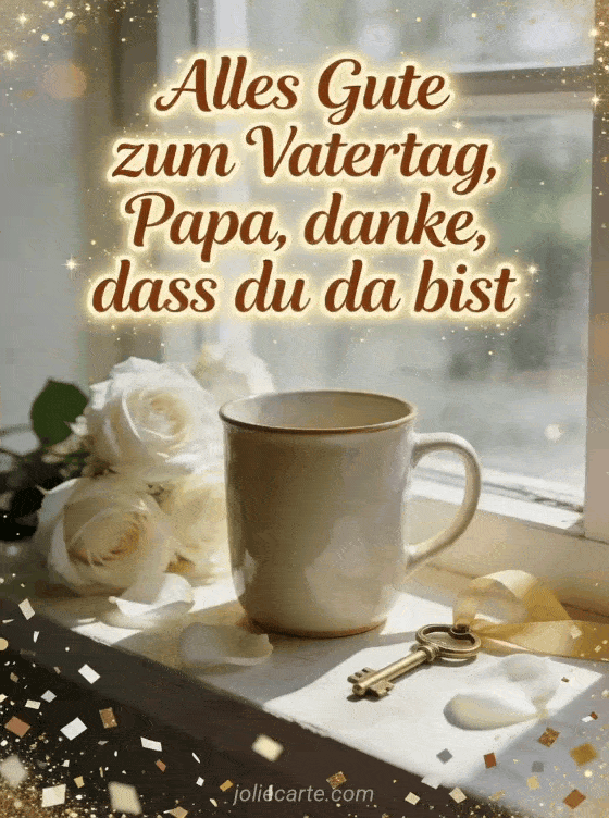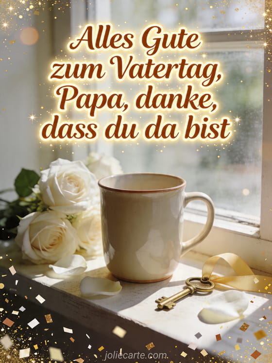 Versende zärtliche Worte zum Vatertag mit warmer kakaobrauner Schrift, einer realistischen Keramiktasse neben weißen Rosenblüten, einem kleinen Messingschlüssel auf einer sonnigen Fensterbank, goldenen Funken und sanftem Bokeh. Entdecke auch ein Vatertagsgedicht, eine Zeichnung Alles Gute zum Vatertag Papa oder Gedicht alles Gute zum Vatertag Papa Güte und Zärtlichkeit.