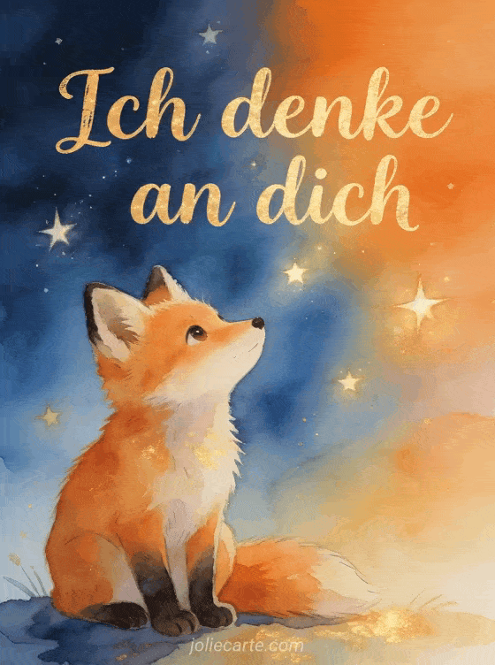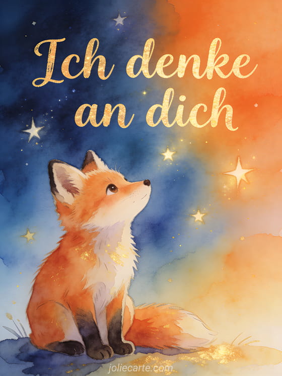 Teile diese wunderschöne handgemalte Karte mit einem kleinen Fuchs, der die Sterne betrachtet. Entdecke auch eine animierte Karte ich denke an dich oder eine Karte Ich denke an dich.