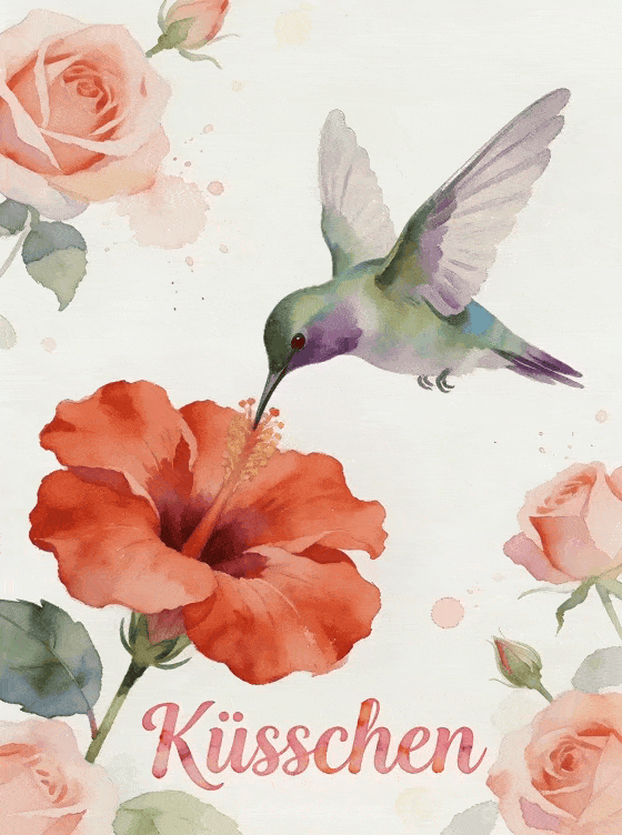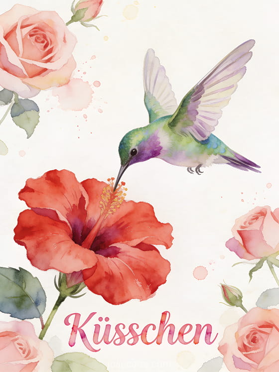 Sende süße Küsschen mit dieser wunderschönen Aquarellkarte mit einem schillernden Kolibri und einer roten Hibiskusblüte. Entdecke auch robbe küsschen oder karte dicke küsse.