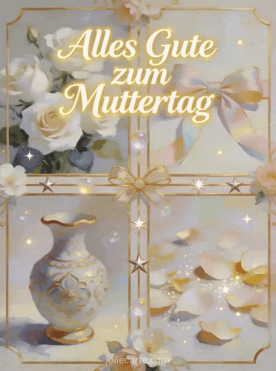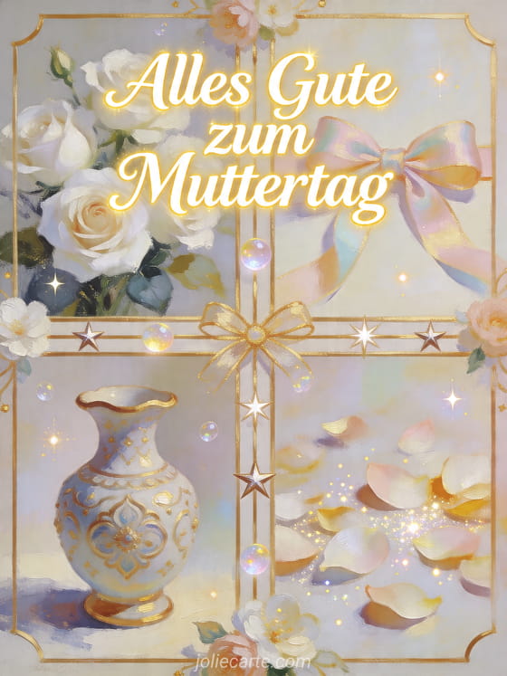 Teile eine Zeichnung zum Muttertag in einer reich gemalten vierteiligen Illustration mit weißen Rosen, pastellfarbener Schleife, dekorativer Keramikvase, funkelnden Blütenblättern, Blumen und Sternen. Entdecke auch Gedicht über den Muttertag, Reim zum Muttertag oder Liebesgedicht zum Muttertag.