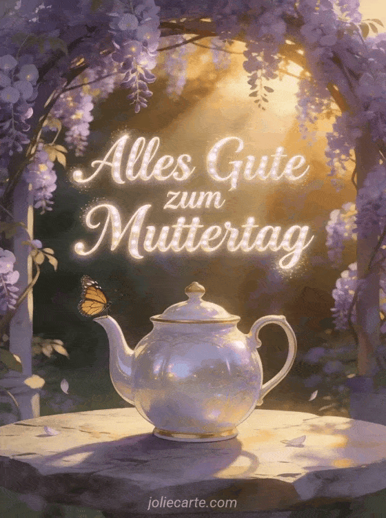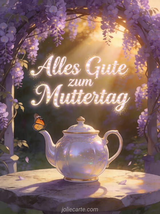 Teile eine leuchtende Karte mit einer Fliederlaube zur goldenen Stunde, einem kleinen Monarchfalter und einer polierten Porzellanteekanne auf einem Steintisch. Dazu passen Muttertag Gedichte, Muttertagsgedichte oder Muttertag Wortspiel.