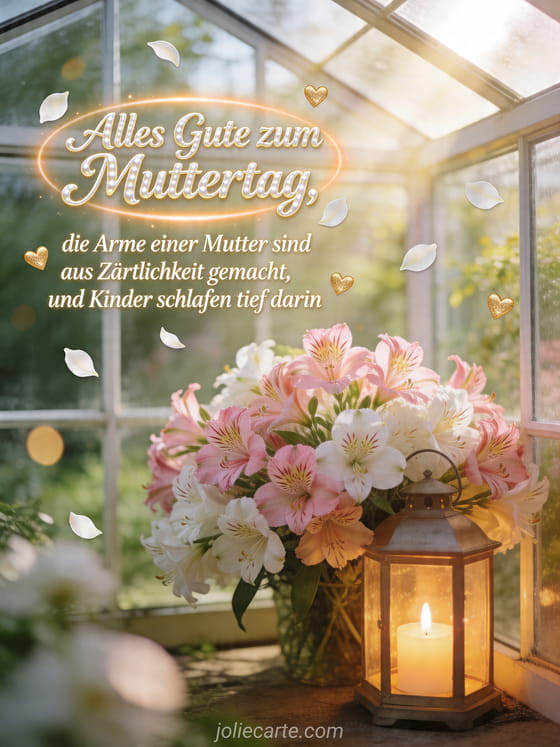 Teile eine zärtliche Muttertagskarte mit perlmuttfarbener Schrift, weißen Blütenblättern, goldenen Herzen, Alstroemerien und einer leuchtenden Kerzenlaterne in einem hellen Gewächshaus. Entdecke auch eine Karte zum Muttertag, gratis Muttertagsbilder oder Muttertagsgrüße.