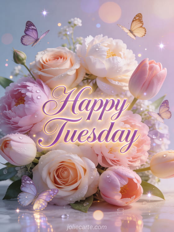 Brighten someone's Tuesday with this elegant greeting card Happy Tuesday featuring a stunning arrangement of roses, peonies and tulips in pastel colors with morning dew and delicate butterflies. Discover also a funny Happy Tuesday card, a Happy Tuesday puppy card or a Happy Tuesday birds card.