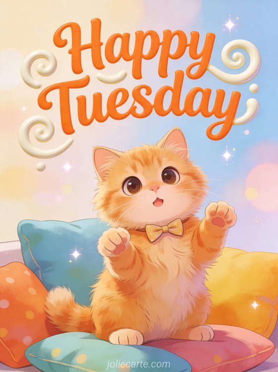 Bring a smile to someone's Tuesday with this funny greeting card Happy Tuesday featuring an adorable fluffy ginger cat with big curious eyes and a tiny bow tie. Discover also a Happy Tuesday puppy card or a Happy Tuesday birds card.