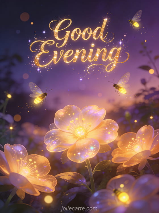 Send a magical good evening greeting with this enchanting card. A twilight garden glows with fireflies and luminescent flowers in warm amber and deep purple atmosphere. Discover also a zen evening card or a good evening card.