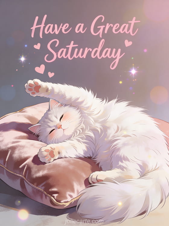 Send an adorable Saturday greeting with this lovely card. A fluffy white persian cat stretching on a velvet cushion in an adorable lazy morning scene. Discover also a funny Saturday frog card.