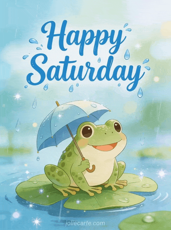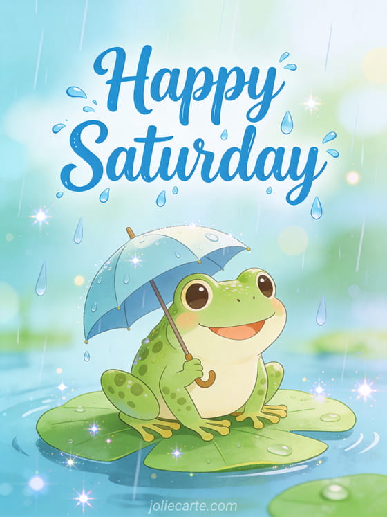 Send a hilarious happy Saturday greeting with this fun card. A happy frog with a tiny umbrella sitting on a lily pad during a comical rainy day, bringing joy and laughter to start the weekend.