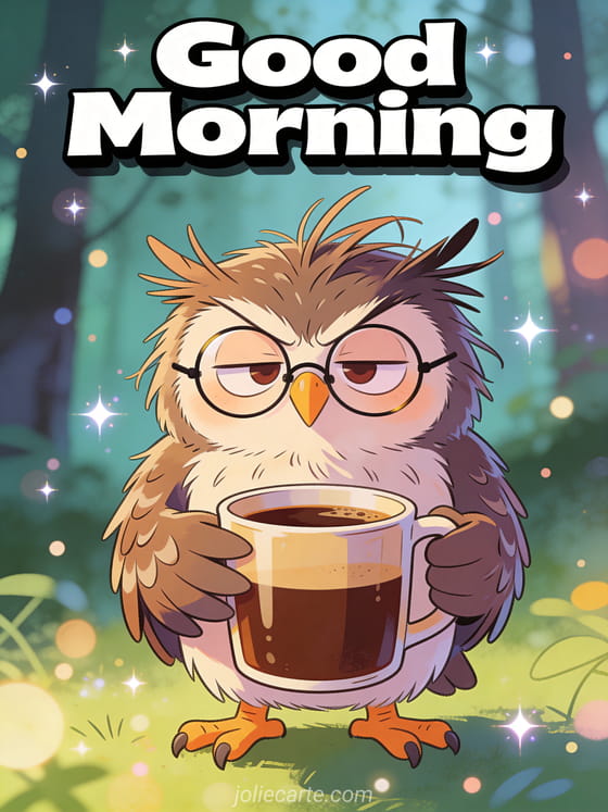 Start someone's day with a smile with this humorous good morning card. A grumpy owl wearing tiny round glasses holds a giant coffee mug, with messy feathers sticking up in a sleepy cartoon forest scene.