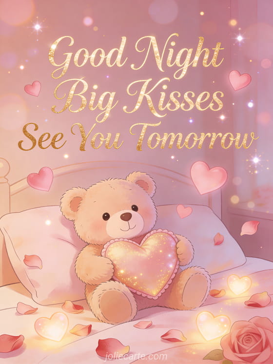 Send a warm good night big kisses see you tomorrow to show your love before sleep. A sweet way to say goodnight with tender kisses and the promise of seeing each other again tomorrow.