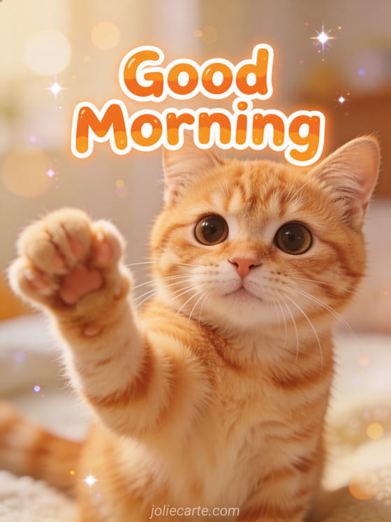 Send a cute good morning with an adorable cat waving to brighten someone's day. Discover also a funny good morning humor image, a touching morning message or a tender morning greeting.