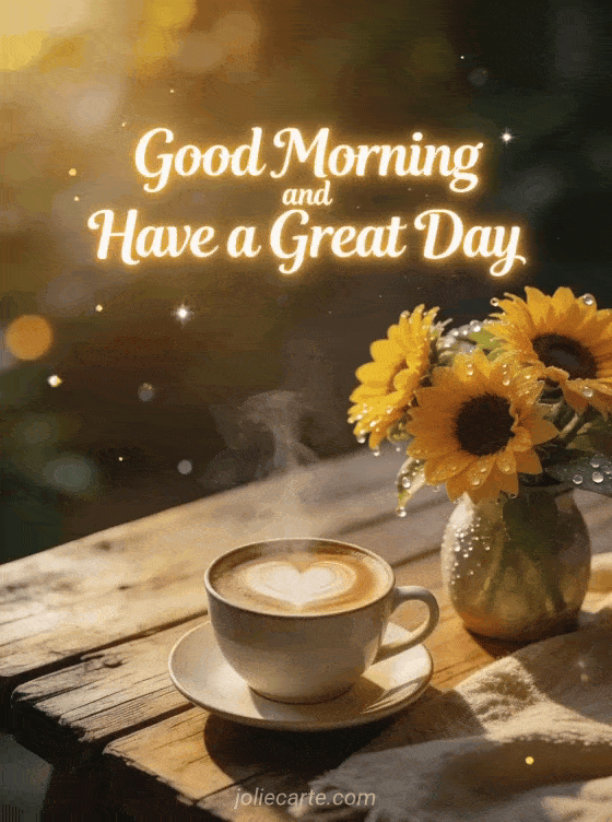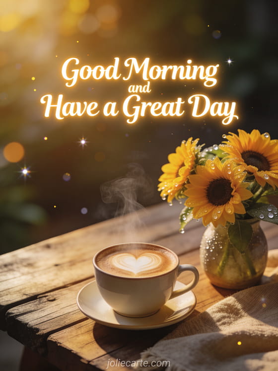 Start someone's morning with warmth and joy by sending this beautiful good morning card featuring a cozy coffee and sunflower scene. A perfect way to wish a great day ahead. Discover also a hello have a great day card, a have a nice day card or a positive vibes have a nice day card.