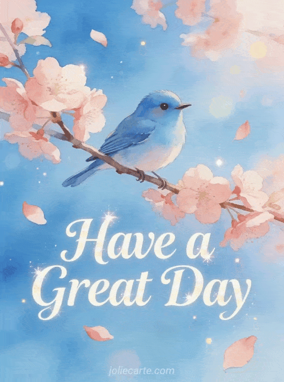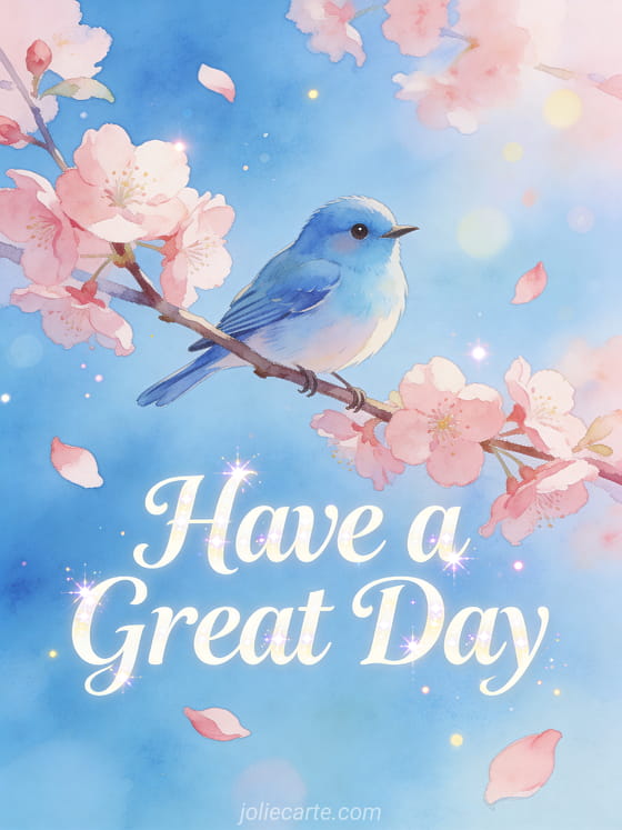 Wish someone a wonderful day with this beautiful greeting card featuring a cheerful bluebird perched on blooming cherry blossoms. A delightful way to spread joy. Discover also a good morning and have a great day card, a hello have a great day card or a have a nice day card.
