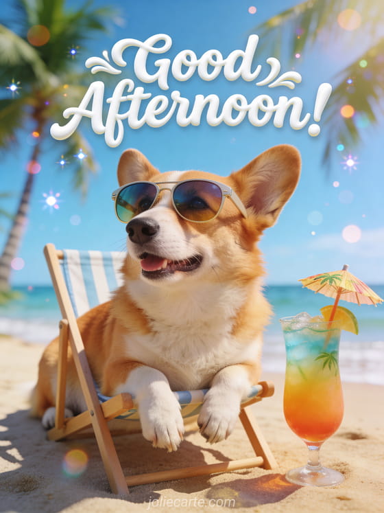 Brighten someone's afternoon with this hilarious greeting card. A funny corgi dog wearing oversized sunglasses lounges on a tiny beach chair with a tropical cocktail. Discover also a sunny afternoon card or a good afternoon greeting.