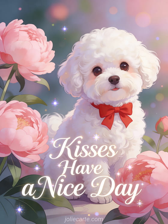 Looking for a sweet way to wish someone a nice day? This beautiful greeting card features an adorable white Bichon Frise puppy wearing a red bow, nestled among lush pink peonies. The elegant script text reads "Kisses Have a Nice Day", making it perfect for sending warm thoughts to loved ones, friends, or family. good day ecard Share this free ecard to brighten someone's morning or afternoon with a touch of tenderness and charm.