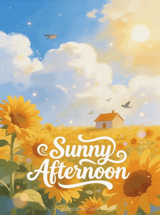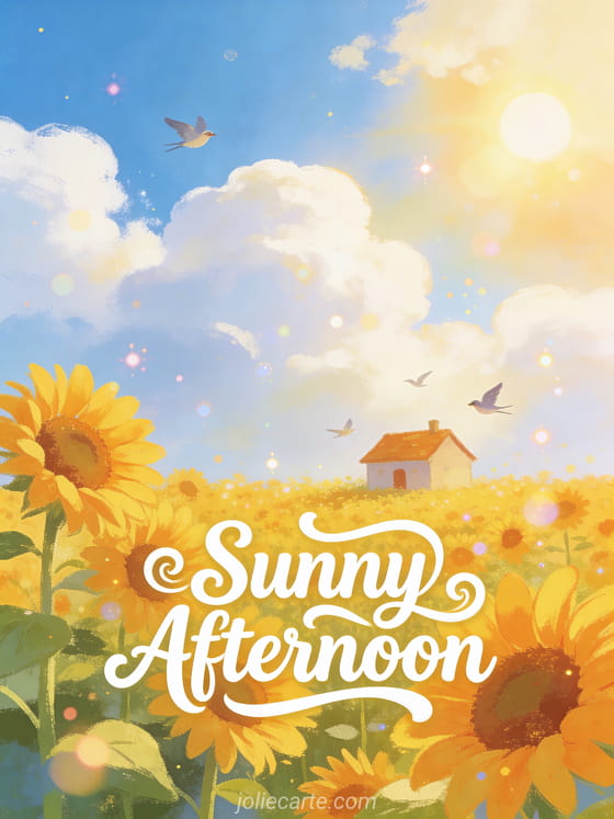 Brighten someone's day with this sunny afternoon greeting card. A cheerful illustration of a sunflower field with a small cottage, bright blue sky with fluffy clouds and birds flying. Discover also a good afternoon card.