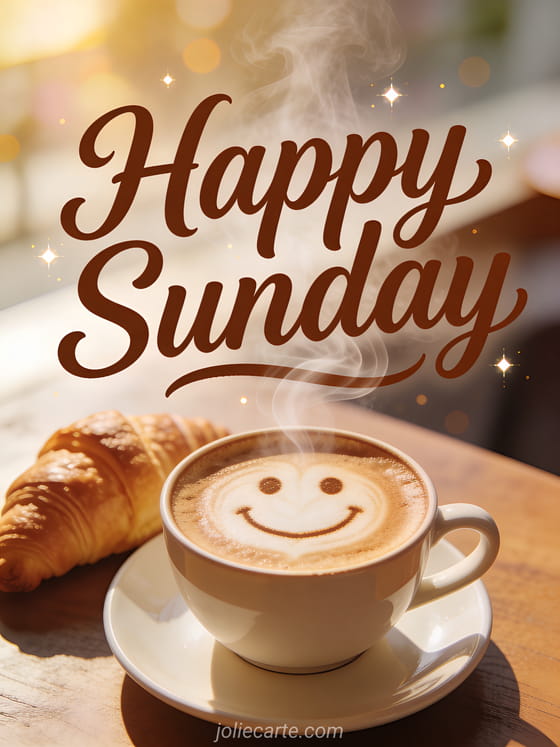 Send a warm happy Sunday greeting with this lovely card. A perfect cappuccino with artistic latte art smile face and a fresh croissant beside it, bathed in morning sunlight. Discover also a tender Sunday kittens card or a happy Sunday kisses card.